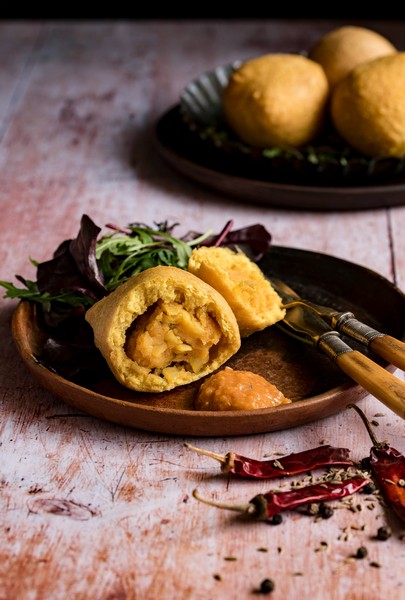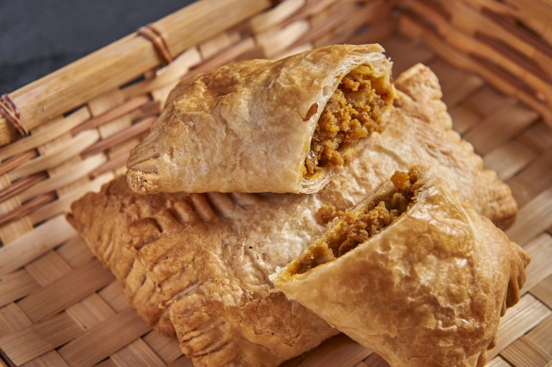 Breadcrumb coated pastry filled with curried potato & chicken.