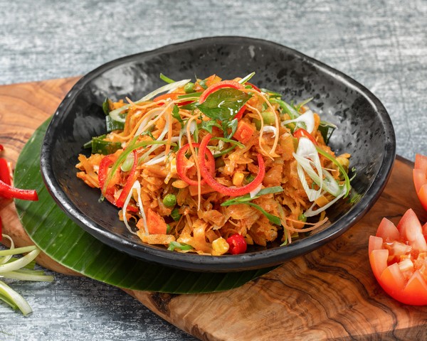 Crunchy chickpea flour noodles, pluses, nuts, and crisps in rich spicy mix